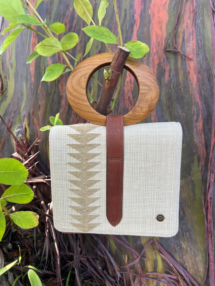 This handbag is a beige handwoven cotton handbag featuring a circular wooden handle, a brown leather strap closure . hand made by artisans in Guatemala